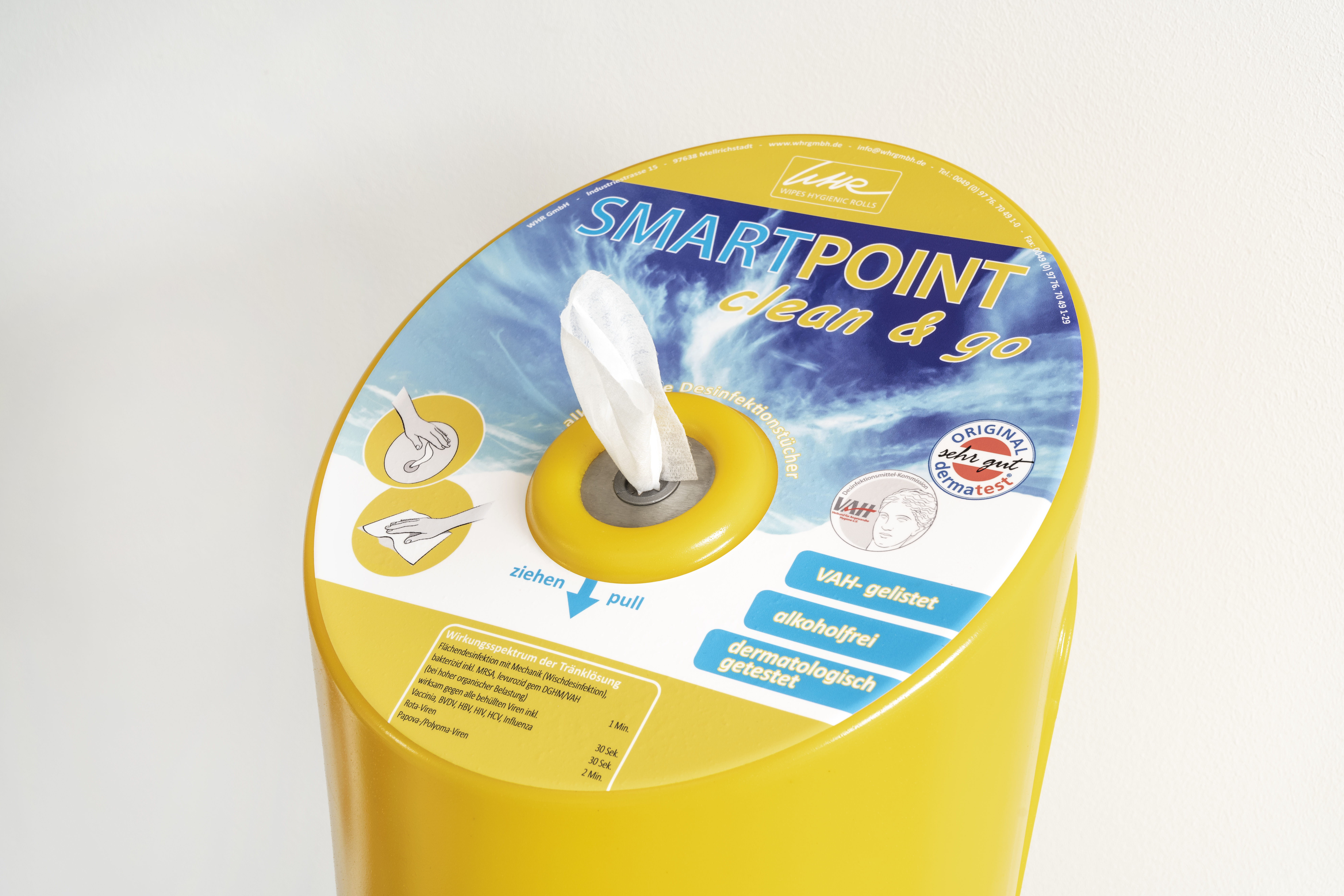 Der SmartPoint ist ein freistehender Feuchttuchspender mit integriertem Abfallbehälter zur Dekontamination von Händen und Oberflächen. Er ist mit den passenden Tüchern sofort einsatzbereit. Durch den SmartPoint wird nachweislich die Verbreitung von Bakterien und Krankheitserregern vermindert. Mit der einfachen Befüllung und Leerung ist er für viele Einsatzgebiete, wie beispielsweise Einkaufszentren, Supermärkte, Sportstätten, Sb- Restaurants, Büros, Produktionsstätten, Tankstellen, Parkplätze oder Reisezentren, geeignet. Die Maße betragen ca. 33 x 33 x 127 cm.